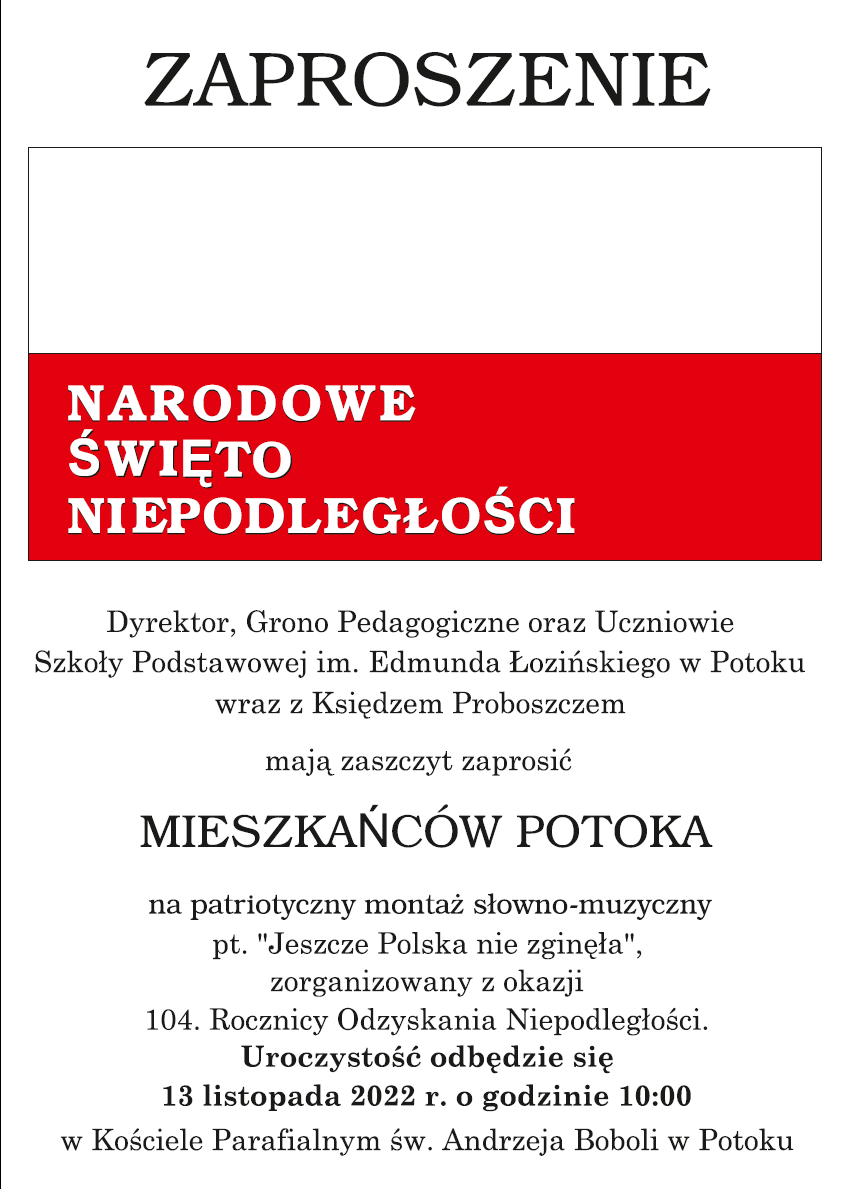 "Jeszcze Polska nie zginęła" - zaproszenie mieszkańców Potoka na patriotyczny montaż śłowno-muzyczny w 104 rocznicę odzyskania przez Polskę niepodległości.