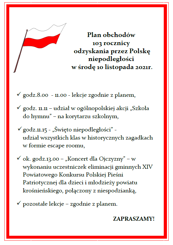Nasza Szkoła została zgłoszona do czwartej edycji akcji Ministerstwa Edukacji i Nauki „Szkoła do hymnu”. W środę 10 listopada 2021 o godz. 11:11 wspólnie odśpiewamy hymn narodowy włączając sie w obchody 103 rocznicy odzyskania przez Polskę niepodległości.